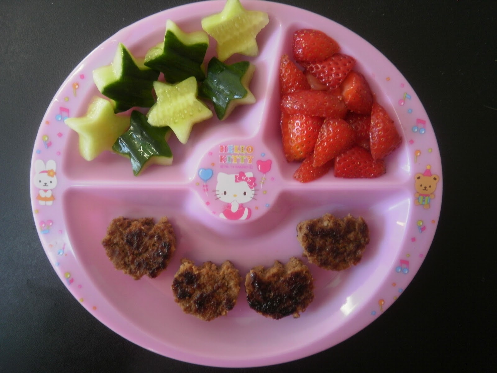 The Hello Kitty Bento Meal consists of star shaped cucumbers, strawberries and mini burgers cut into paws – Hello Kitty Paws!