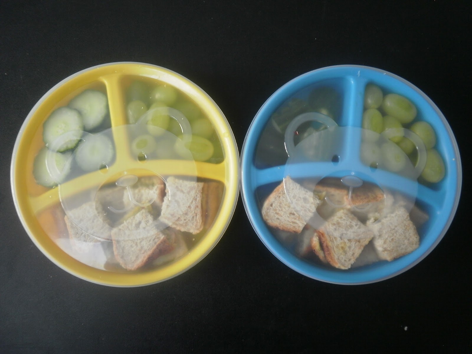 When Mr 3 saw the two boxes, he insisted the blue would be his, so the yellow belonged to Mr 20 months! Included in their lunches were Avocado and Jam Sandwiches, Grapes and Cucumbers.