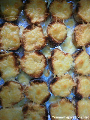 I saved my final dish to prepare just before the guests arrive. At the last minute I sliced a baguette into little rounds, topped each with a small amount of grated cheese and stuck them under a hot grill until they were crisp and browned. My Mom used to make this yummy treat for my Sister and I almost every Sunday evening. I thought it fitting to include this special dish from my childhood, to share with my Mom and Sister.