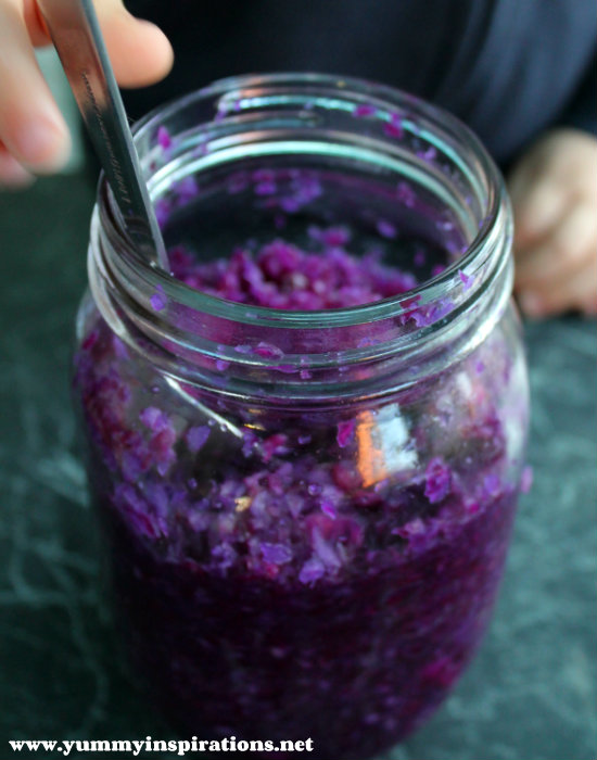 My 4 year old helped me transfer the pounded purple cabbage into it’s waiting jar, while occasionally making grossed out expressions at the cabbage aroma wafting out from the jar.